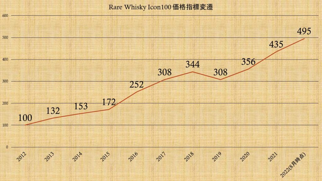 ※「Rare Whisky Icon 100 価格指数」はスコッチウイスキー100銘柄の価格上昇の平均値